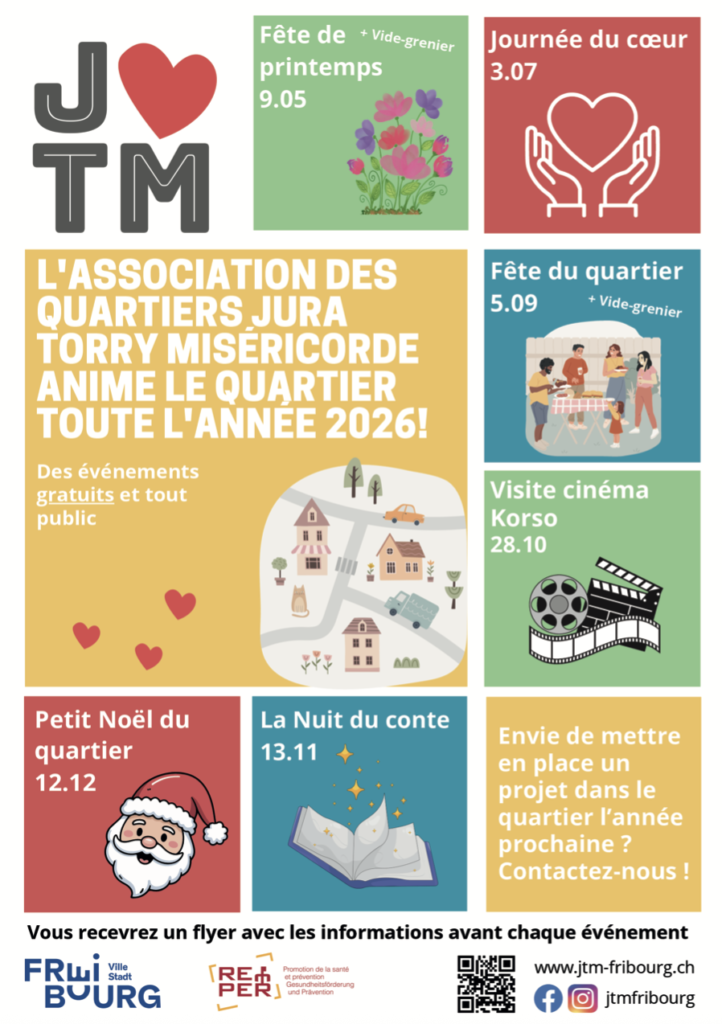 L'association des quartiers Jura Torry Miséricorde agit comme une plateforme d’information, d’échange et de dialogue pour la promotion de la qualité de vie des habitant.e.s et la représentation des intérêts de ses membres.